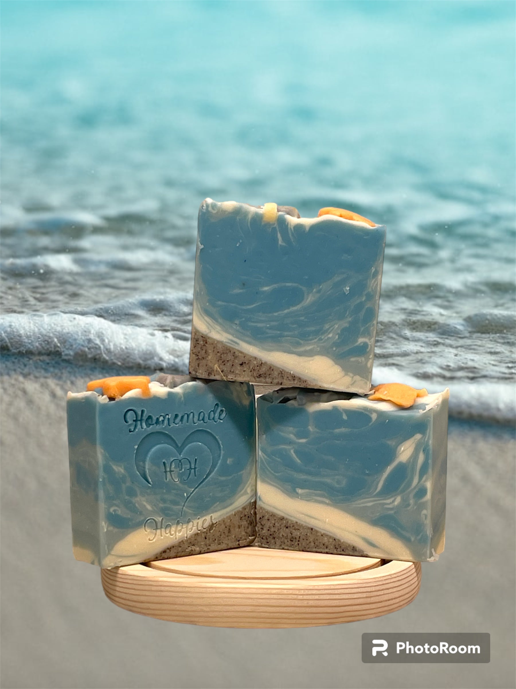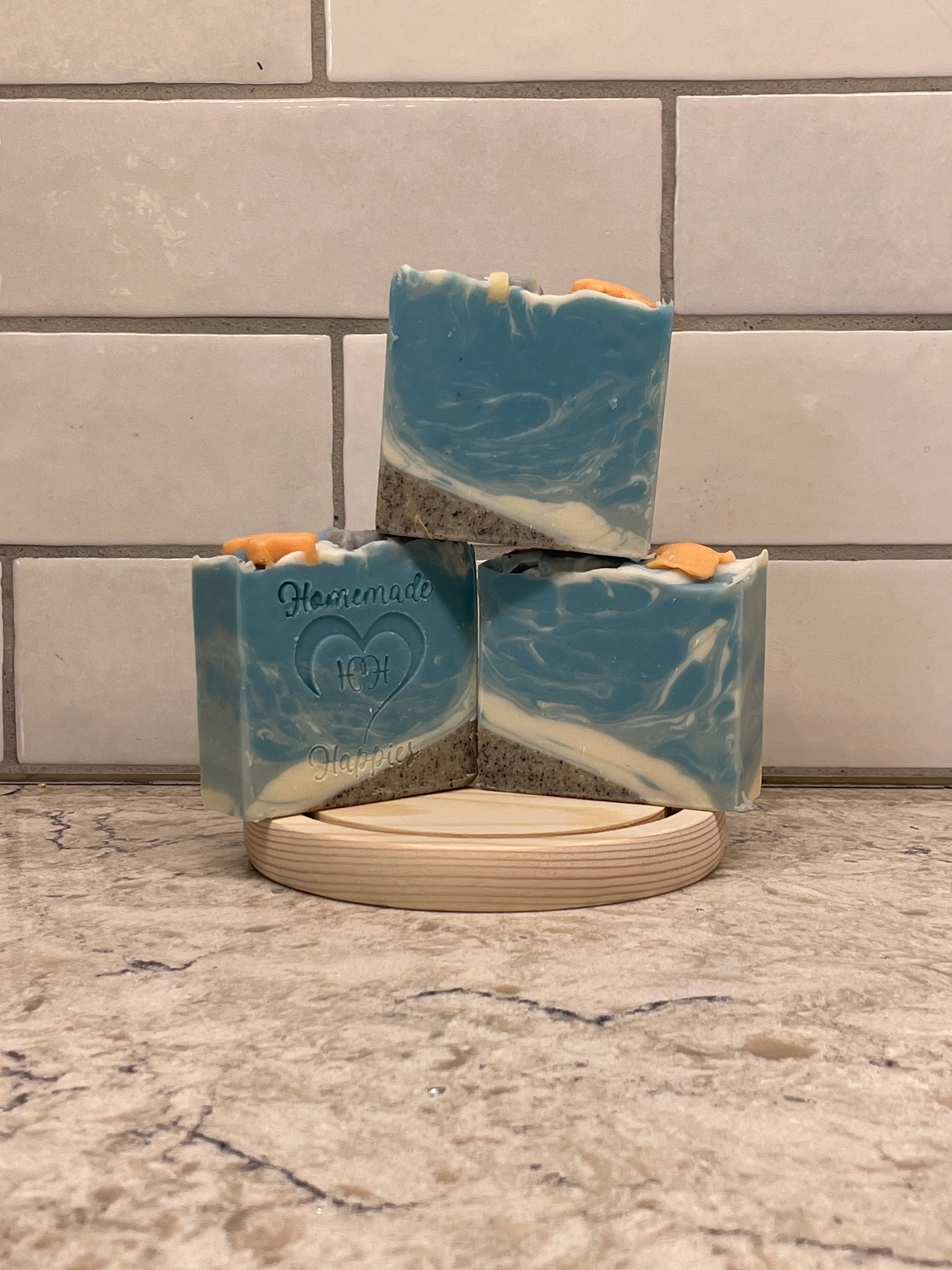 Toes in the sand....a drink in your hand....🎶. This amazing bar makes you think of beaches with both the scent and the look! The sand incorporates coffee grounds for alight exfoliant and an amazing sandy look! Then let the ocean swirls takes you away while you smell the beach flowers, driftwood, musk, and other aquatic undertones. They are topped with soap dough starfish and sharks.