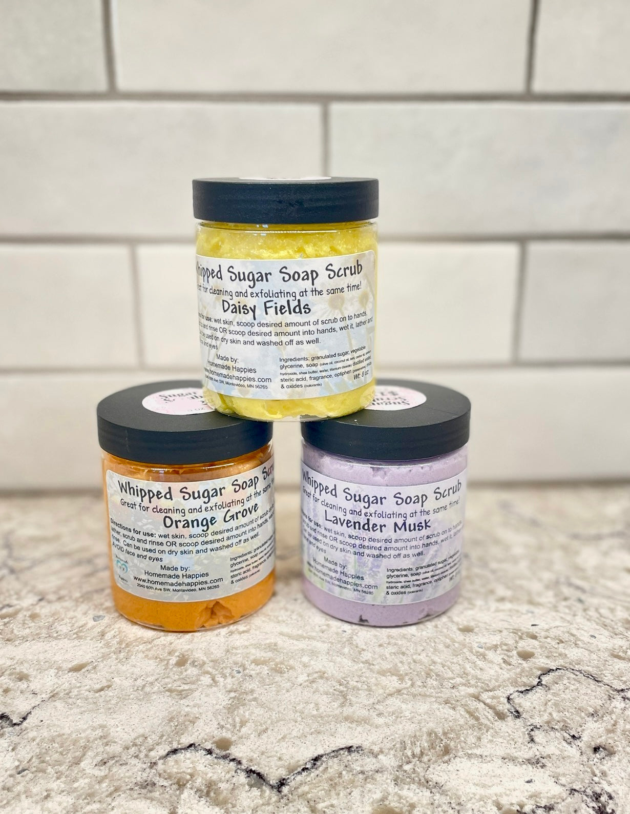 Clean and exfoliate at the same time! This whipped sugar soap scrub is probably like nothing you've tried before. Made from my soap and whipped up light. This fantastic scrub will help you clean without drying your skin out.